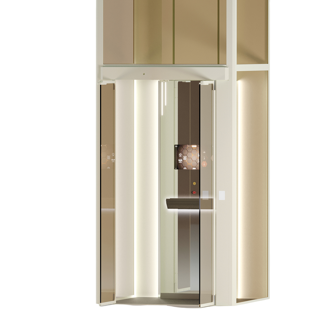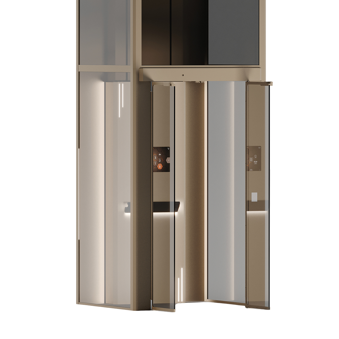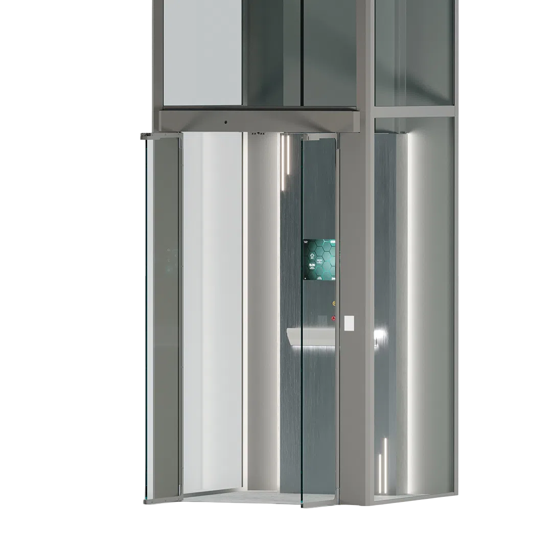 Se suministra con puertas automáticas de cristal completo y una amplia gama de acabados personalizables, incluyendo vidrios ahumados, acero inoxidable y suelos en PVC efecto mármol u hormigón. Además, puede instalarse en ejes panorámicos acristalados, ideales para ambientes luminosos y modernos.